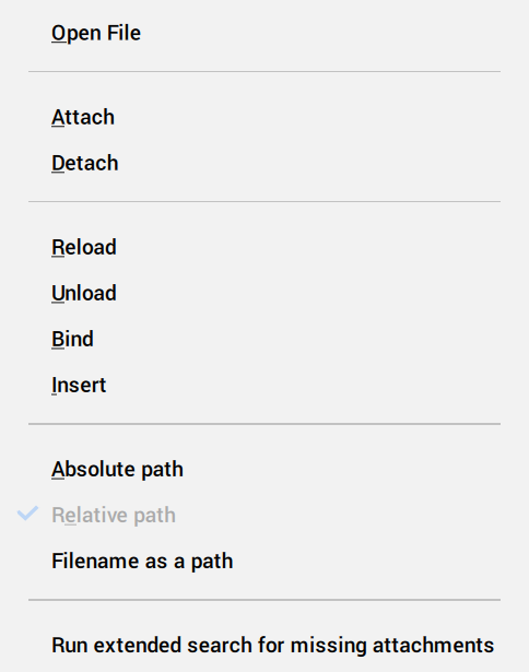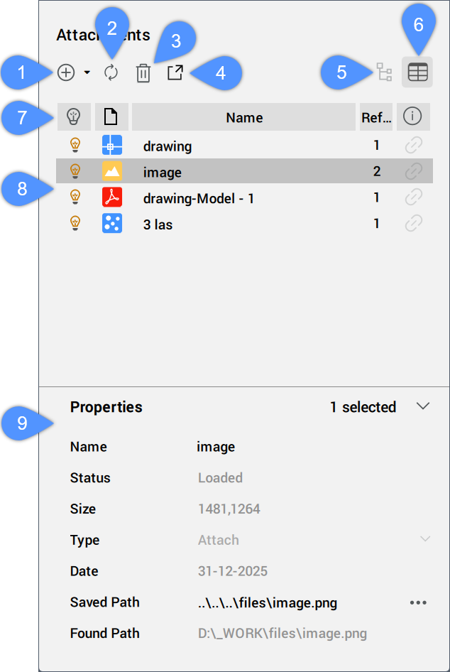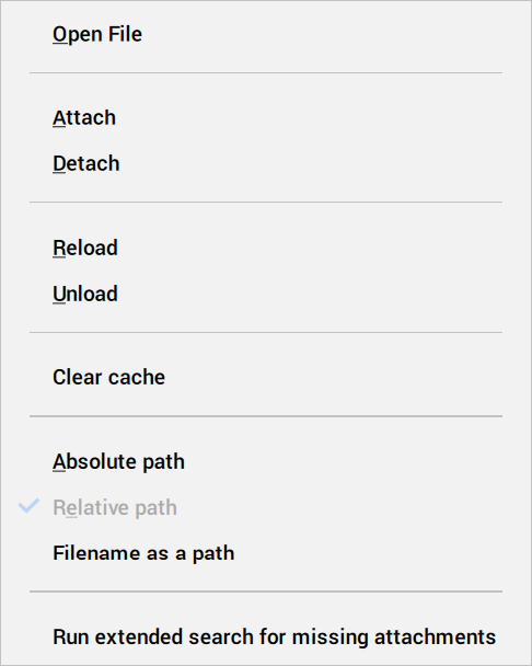- Unload: the attachments are not loaded or displayed in the drawing editor, but maintain their attachment information, such as scale and location.