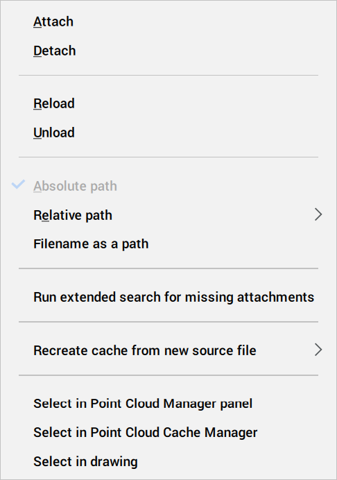 - Displays the Point Cloud Cache Manager dialog box, as the POINTCLOUDREFERENCE command does.