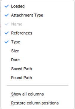 Column headers describe the properties of each attachment. You can sort the attached files list in ascending or descending order for any property by clicking once or twice on the column header. A right-click menu on the column headers enables you to customize them: