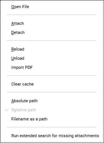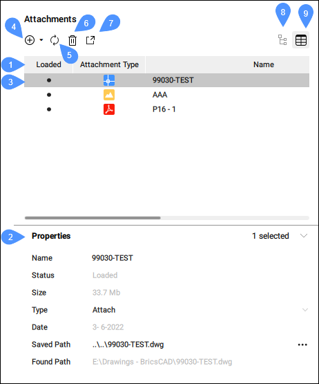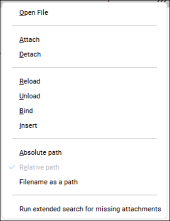 - Unload: the attachments are not loaded or displayed in the drawing editor, but maintain their attachment information, such as scale and location.