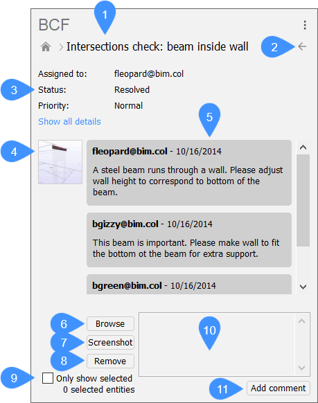- Comments can only be added if a BCF cloud service was selected. They cannot be saved to BCF files since this options allows you to read a BCF file.