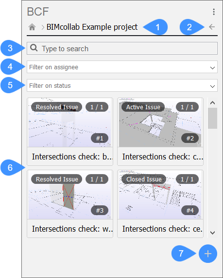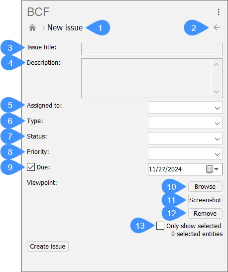- Allows to add and define a new issue.Note: This option is only available when logged in with a BIM collaboration cloud service.