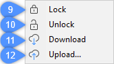 (9) Locks the document so no changes can be made. (10) Unlocks the document so changes can be made. (11) Downloads the latest revision from the cloud. (12) Uploads your drawing as a revision of the original drawing. See the CLOUDUPLOADDEPENDENCIES system variable options.