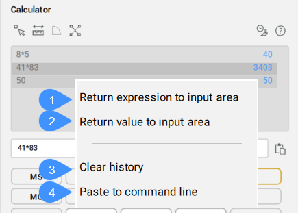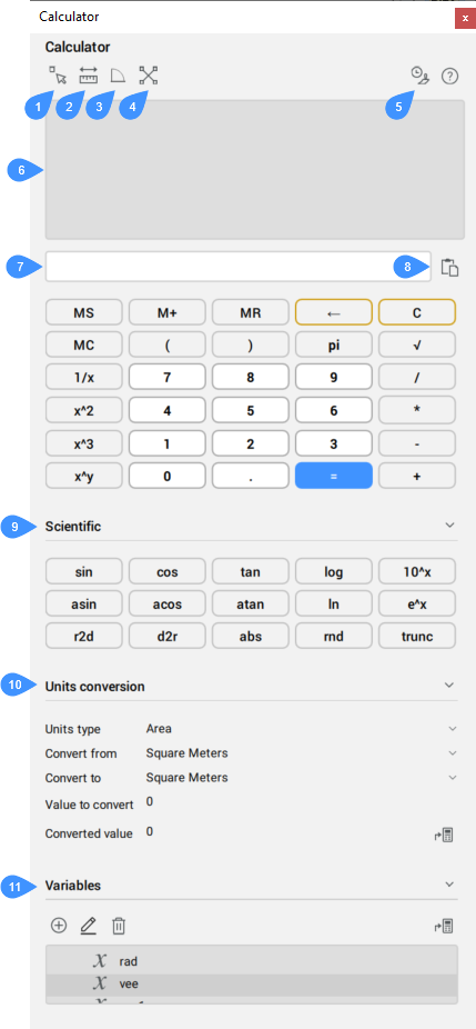 The Calculator panel provides a way to perform calculation inside BricsCAD®. It has geometric functions, unit conversions, variables, and the basic features of a scientific calculator.