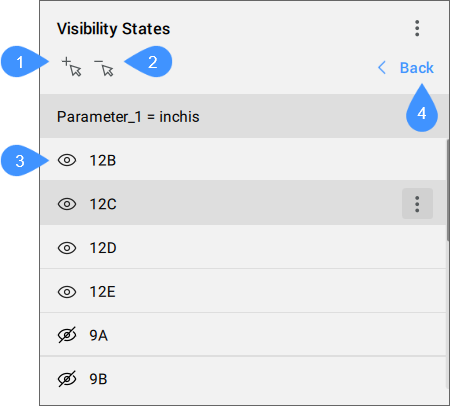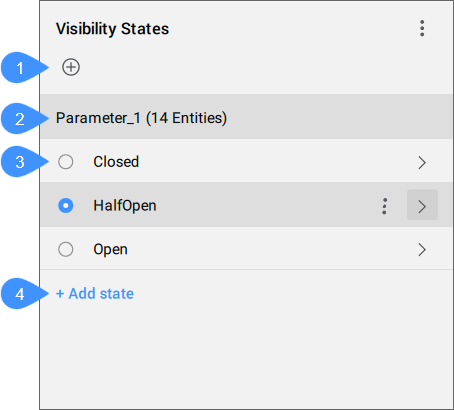 Lists all the parameter's visibility states. Double-click a state name or click the right-side arrow to access its entities.