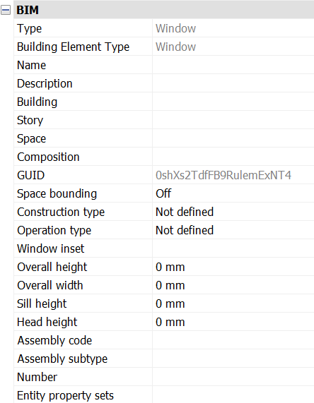 Cuando clasifica una entidad, se muestra una serie de propiedades con respecto al tipo de elemento de construcción en el panel Propiedades .