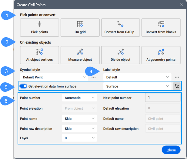 El cuadro de diálogo Crear puntos civiles le permite crear puntos civiles especificando su posición en el dibujo, convirtiendo puntos CAD o bloques en puntos civiles, o generando puntos civiles en objetos seleccionados.