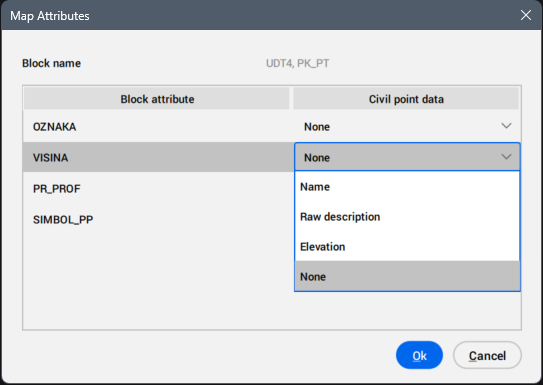 Se abre el cuadro de diálogo Atributos del mapa para bloques con atributos y permite asignar atributos del bloque a atributos del punto civil, como Nombre, Descripción sin procesar, Elevación o Ninguno.