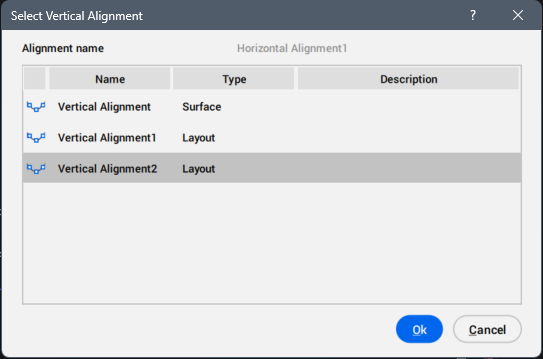 - Crea puntos civiles a lo largo de una alineación. Cuando la alineación horizontal incluye una alineación vertical y el atributo Elevación del punto está establecido en A partir de un objeto, se abre el cuadro de diálogo Seleccionar Alineación Vertical. Esto le permite establecer las elevaciones de los puntos civiles en la alineación vertical seleccionada.