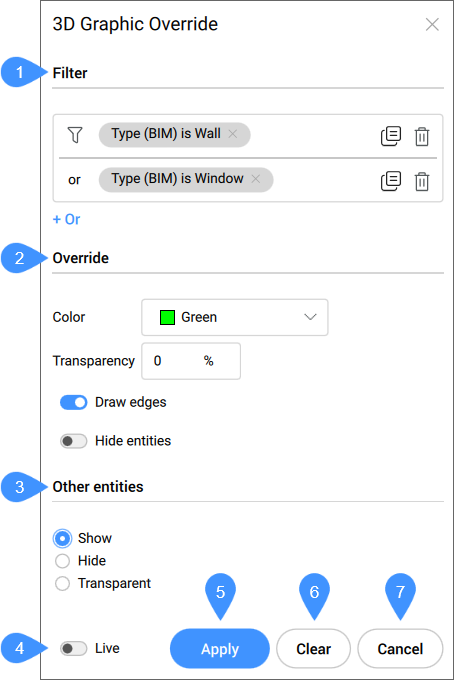 GRAPHICOVERRIDE es una función de personalización de dibujos 3D que permite anular temporalmente el aspecto visual de una selección específica de objetos basándose en las propiedades BIM.