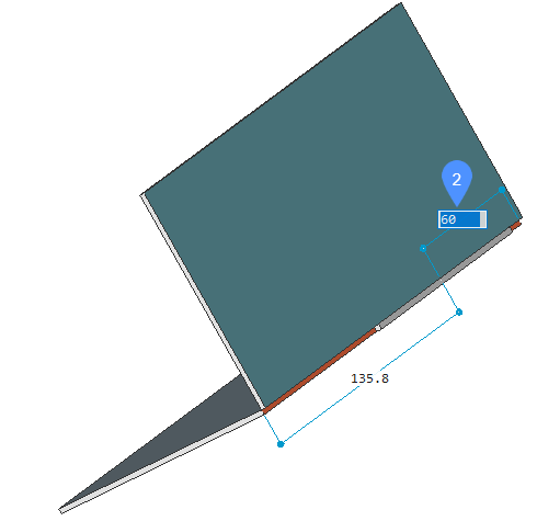 - Posiciona la pestaña a lo largo del cruce. Los campos de dimensión dinámica muestran la distancia a los puntos finales de la unión (2). Pulse la tecla TAB para cambiar entre los campos Ángulo y Longitud.