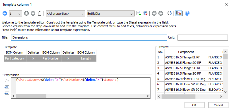 Cette boîte de dialogue vous permet de définir le titre et l'unité de la colonne, de mettre à jour l'expression à l'aide d'un éditeur avec la mise en surbrillance de syntaxe et la réalisation automatique, et d'afficher un aperçu du tableau de nomenclature avec la colonne évaluée. Pour une colonne modèle, la section Modèle vous permet d'insérer, de déplacer et de supprimer facilement des propriétés, ainsi que des délimiteurs et des textes personnalisés.
