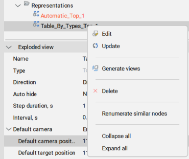 Éditer | Ouvre la représentation pour l'éditer. Remarque : Si elle est configurée, la caméra personnalisée de l'étape en cours est utilisée. Sinon, si l'option est activée, la caméra par défaut de la vue éclatée est utilisée, et si elle ne l'est pas, c'est la caméra actuelle qui est utilisée.