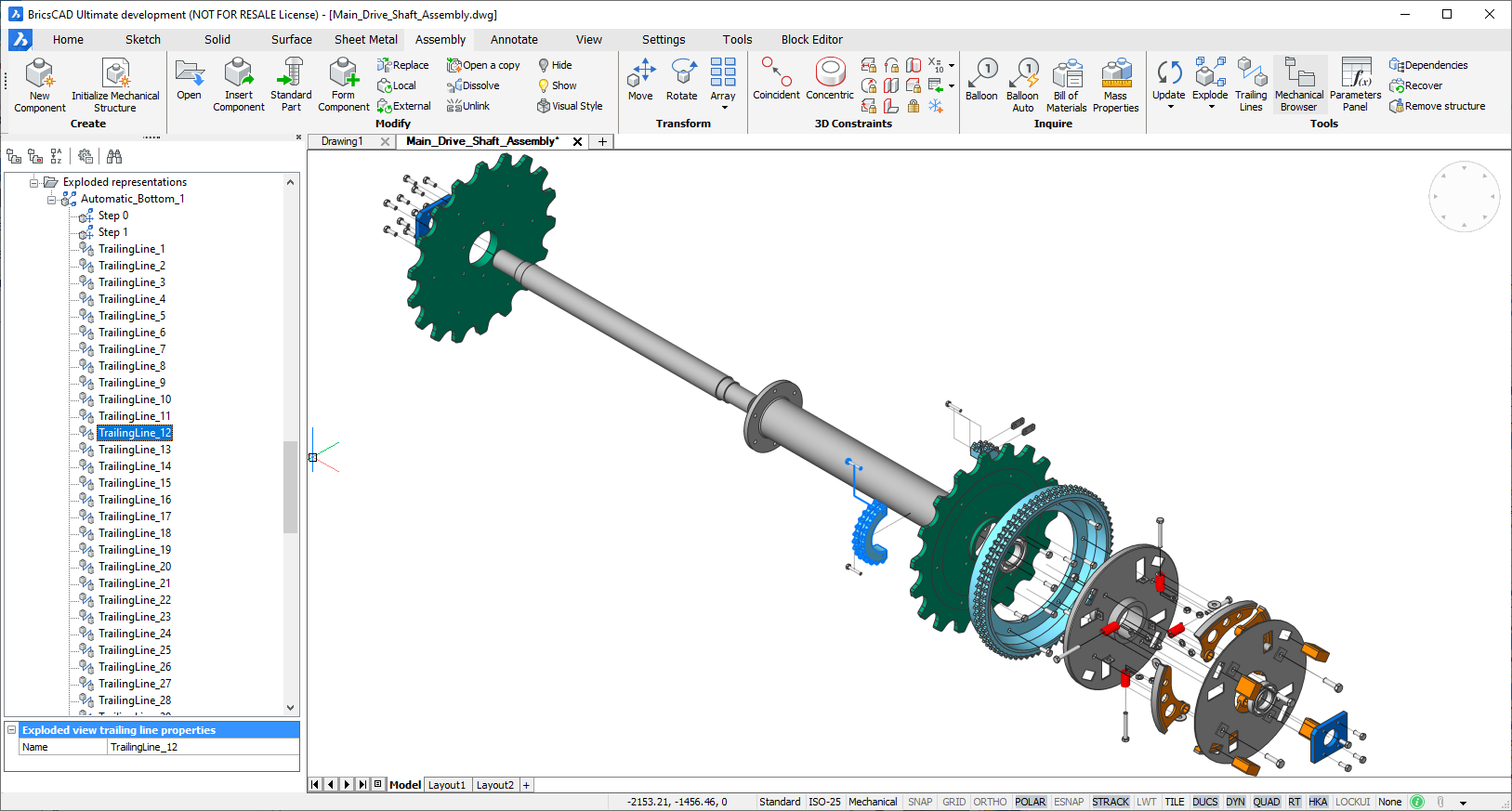 Utilisez la commande BMLIGNESMONTAGE pour ajouter des lignes de montage à une représentation ouverte pour la modification. Cet outil crée toutes les lignes de montage. Les informations des étapes de la vue éclatée sont utilisées pour ce faire.