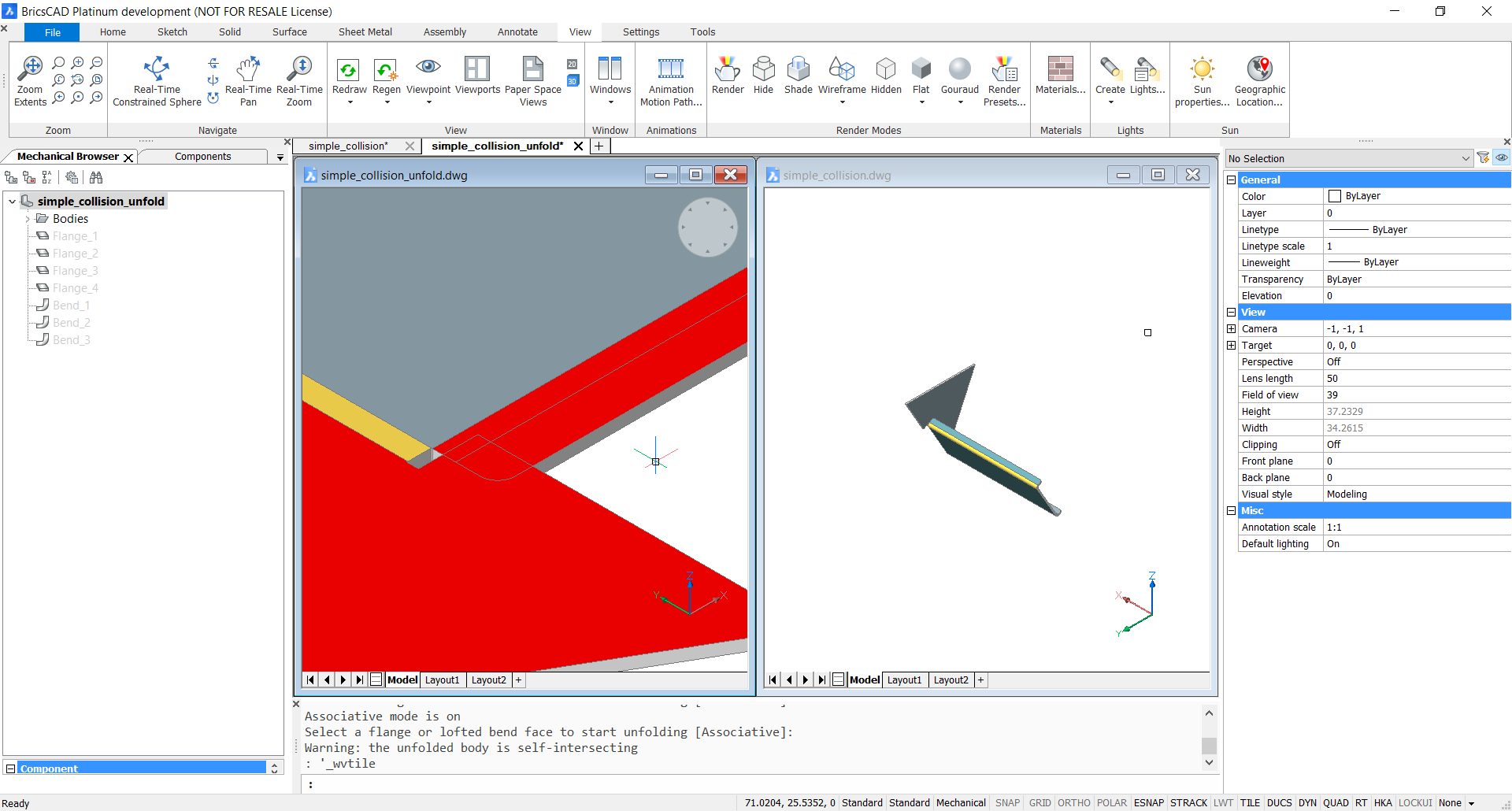 L'application calculera l'aplanissement de la pièce donnée et la basculera en mode associatif. La condition de réussite d'une opération donnée est la même que pour un dépliage régulier. Continuez à travailler en mode associativité uniquement si aucune erreur ou avertissement n'est apparue pendant l'opération. Un nouveau document temporaire contenant la pièce aplanie sera créé.