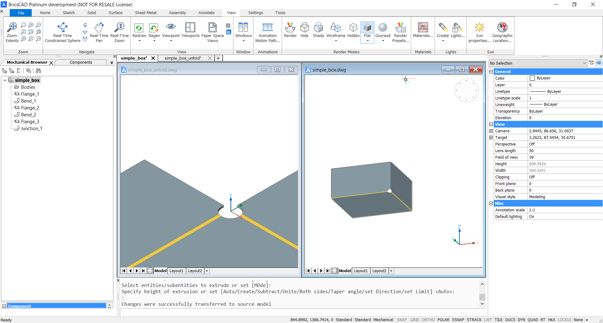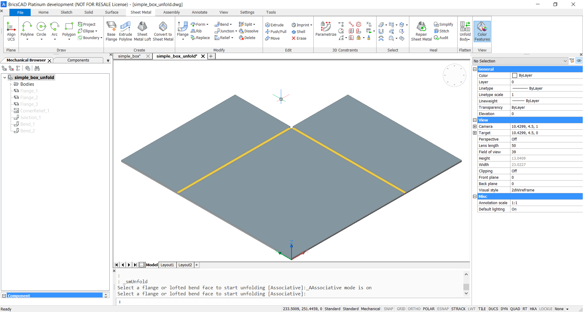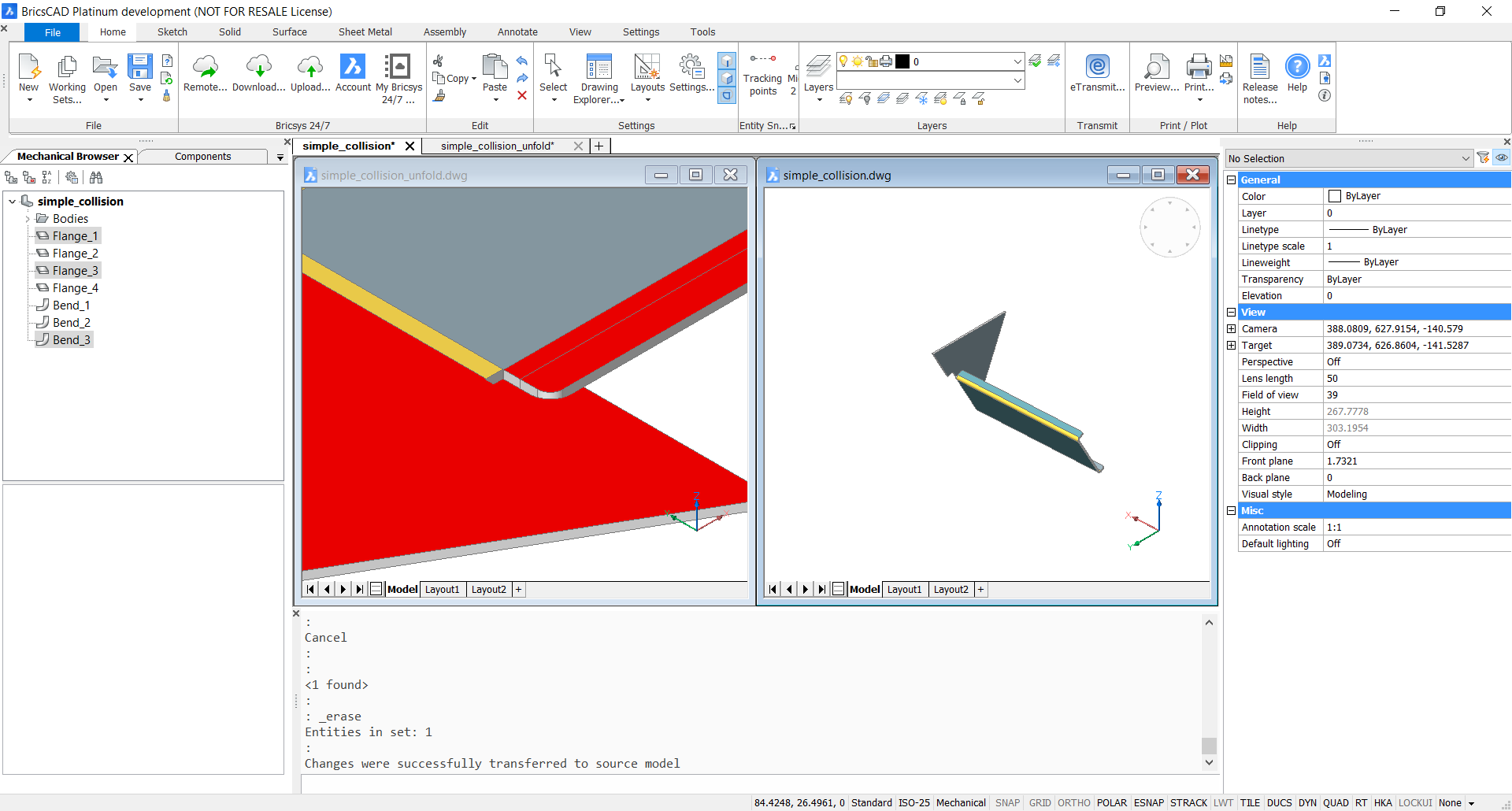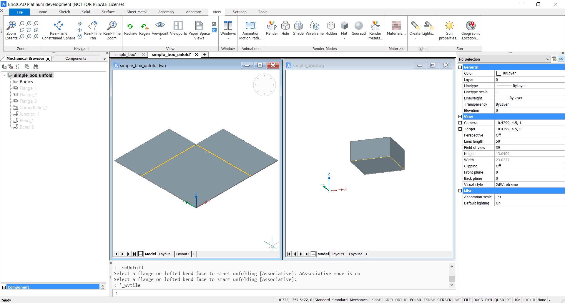 BricsCAD® offre une associativité bidirectionnelle entre la partie de tôle 3D et son aspect aplani. Dans ce mode, les deux représentations existent dans des documents distincts : la Pièce d'origine est stockée dans son document natif et la Pièce aplanie est stockée dans un document temporaire. L'associativité est temporaire et existe lorsque les deux documents sont ouverts. Afin de travailler en mode associativité lors de la prochaine session de BricsCAD® ou une fois le document fermé, vous devez répéter les étapes.
