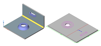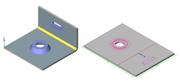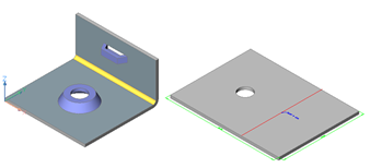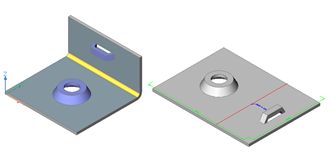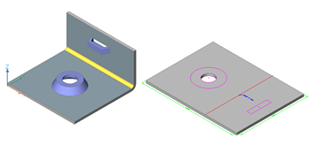La commande TOLDEPLIER permet de déplier des pièces de tôle. BricsCAD crée automatiquement un corps solide correspondant à la feuille de métal plate nécessaire à la fabrication de la pièce de tôlerie à l'aide de techniques de pliage. Cette feuille est placée sur le plan XY et orientée le long des axes de coordonnées de la même manière que l'orientation du corps initial dans l'espace 3D. Pour modifier l'orientation du dépliage sur l'axe Z, exécutez à nouveau la commande TOLDEPLIER et sélectionnez la face opposée du corps initial.