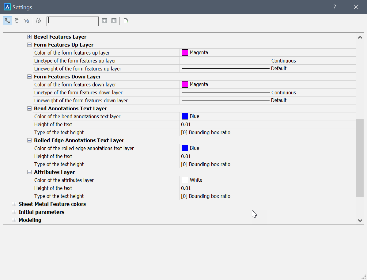 Vous pouvez définir les couleurs différemment dans le groupe de paramètres Tôlerie/Commandes/Calques pour le dépliage de la boîte de dialogue Paramètres. Chaque type d'entité est placé sur un calque dédié dont la couleur est contrôlée via une série de préférences utilisateur :