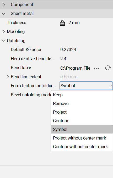 Le mode de dépliage de la pièce en tôle actuelle peut être défini dans Navigateur mécanique.