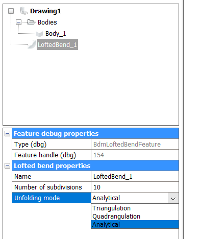 Les plis de transition posés sur des surfaces cylindriques et coniques peuvent être dépliés d'un point de vue analytique : les cotes et la forme du pli de transition déplié seront comme si sa surface moyenne était mathématiquement déroulée sur le plan. Cette forme peut également être obtenue par un nombre très élevé d'échantillons pour le pli de transition. Vous devez régler le Mode de dépliage individuellement pour chaque fonction de pli de transition. Si le dépliage analytique est autorisé, l'option sera présente dans une liste déroulante :