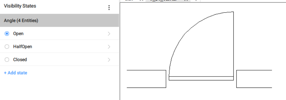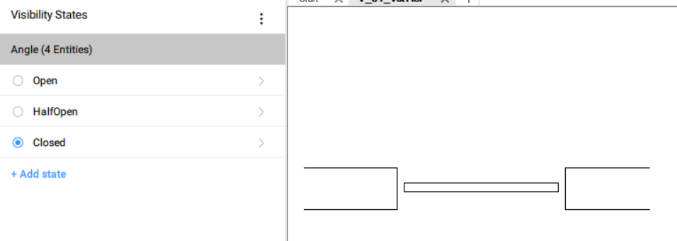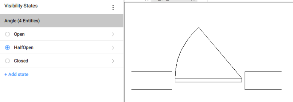 ) en haut du panneau États de visibilité. Un nouveau paramètre est créé et son nom peut être mis à jour. Pour cet exemple, nommez le paramètre de visibilité Angle. - Pour ajouter un état, cliquez sur le bouton +Ajouter un état sous l'étiquette de nom du paramètre. Un nouvel état de visibilité est créé et son nom peut être modifié. Pour cet exemple, le nom des trois états de visibilité sont Ouvert, À moitié ouvert et Fermé.
