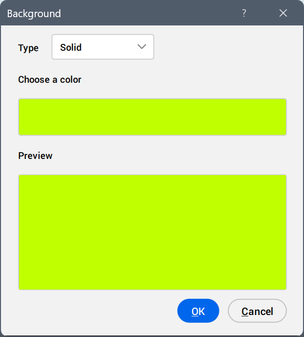 - Spécifie la couleur actuelle de l'arrière-plan solide. Cliquez sur l'échantillon de couleur pour afficher la boîte de dialogue Sélectionner une couleur et spécifiez une autre couleur.