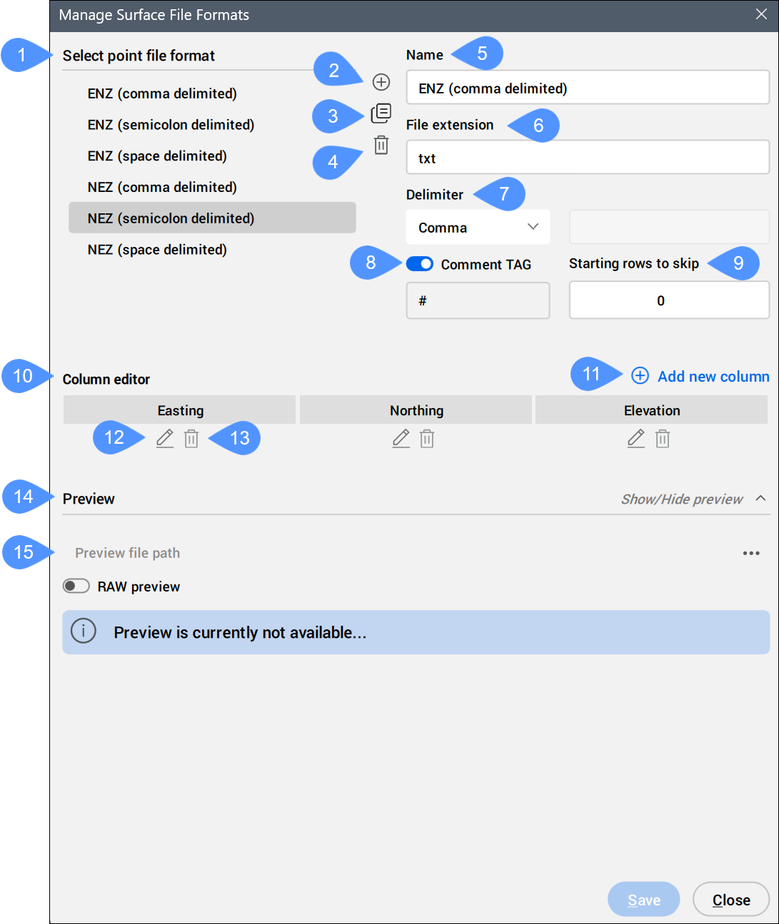 La boîte de dialogue Gérer les formats de fichier de surface vous permet d'ajouter un nouveau format de fichier de points ou d'en modifier un existant.