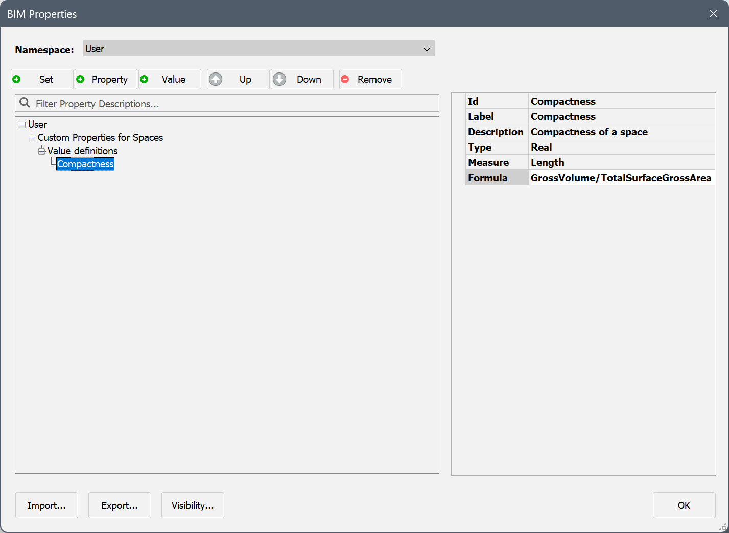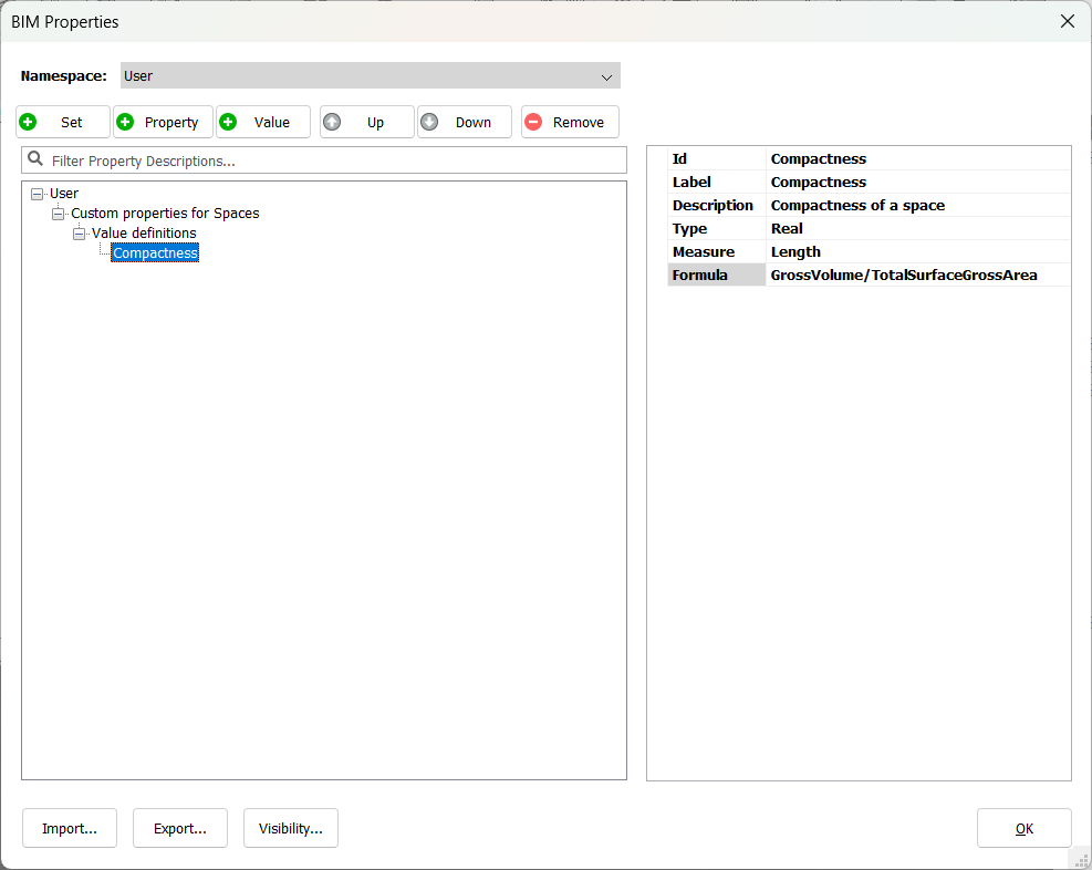 ここでは、ユーザーが設定可能な数量の作成方法について説明します。たとえば、部屋のような空間オブジェクトの数量を定義してみましょう。定義する数量を密集性とし、空間の体積を、その空間のすべての側面の面積の合計で割った値とします。