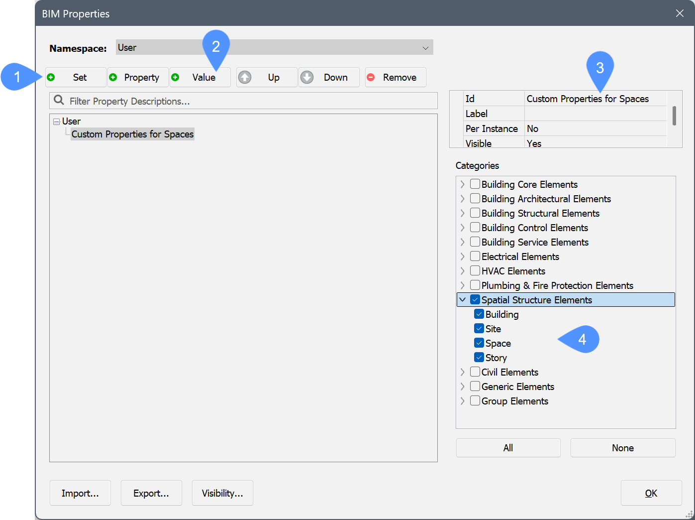 - プロパティセットを1つまたは複数のカテゴリー(4)に割り当てます。この例では、空間要素に割り当てます。
