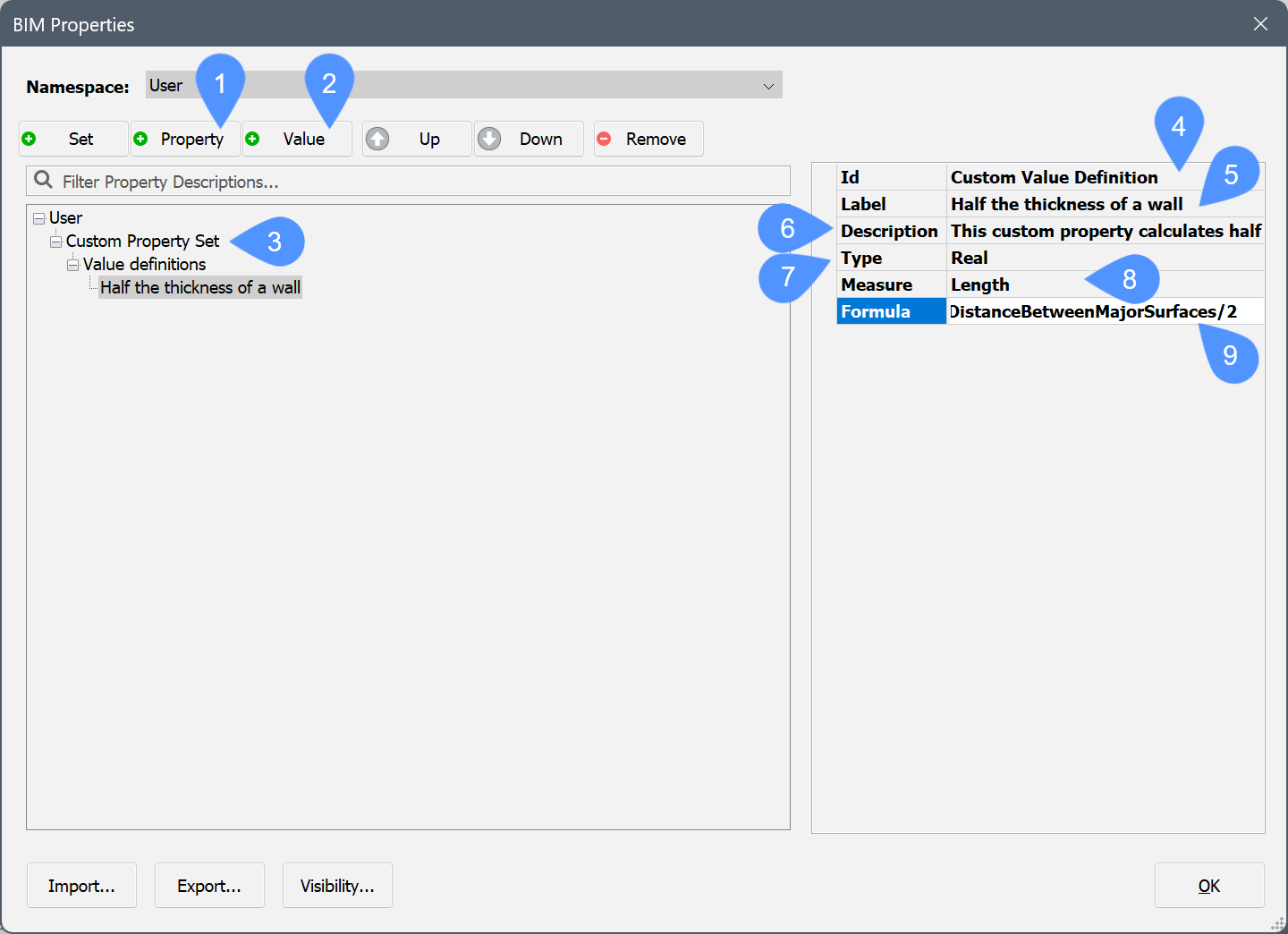 BIMプロパティダイアログボックスで利用可能な名前空間は、デフォルトではIFC(1)、数量(2)、ユーザー(3)の3つです。IFC名前空間には、IFC2x3とIFC4のスキーマで定義されたプロパティが含まれており、IFCの読み込みや書き出し時にバックグラウンドで自動的に結合されます。このプロパティには、共通プロパティ(例: 耐火等級や遮音等級などの壁の共通プロパティ)と数量 (例: (4))の両方が含まれます。これらの数量は、ソリッドのいわゆるコア数量(5)に基づきます(コア数量の項を参照)。