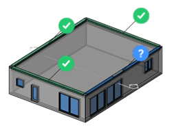緑色のチェックマークは、Enterを押すと、この提案が適用されることを意味します。疑問符は、考えられる幾つかの理由の一つが原因で、提案が適用されないことを意味します。ウィジェットの上でマウスカーソルを動かすと、詳細な情報が表示されます。この場合、元の詳細の場所と書かれています。クリックすると、元の詳細が適合した押し出しで置換されます。壁のキャップは局所的にしかモデル化していないので、元の詳細を壁の全長をカバーするように適合した押し出しで置換する必要があります。ウィジェットをクリックすると、緑色のチェックマークに変わります。