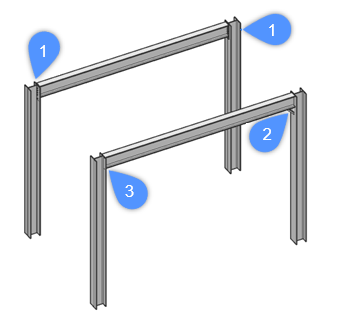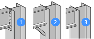 - 以下のような4本の柱と2本の梁の場合を考えてみましょう。そのうち2つの接続部は、プレートとボルトを柱のフランジに通して設計されています(1)。もう1つの接合部は、斜材を使い回転剛性を強化する設計になっています(2)。最後の接合部はまだ設計されていません(3)。