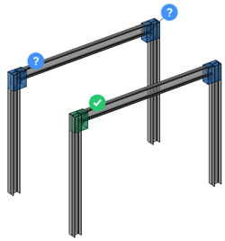 緑色のチェックマークは、Enterを押すと、この提案が適用されることを意味します。疑問符は、考えられる幾つかの理由の一つが原因で、提案が適用されないことを意味します。ウィジェットの上でマウスカーソルを動かすと、詳細な情報が表示されます。この場合は、既存の詳細が検出されました。提案は適用されません。クリックすると、変更されます。ボルト接合を対角部材に置換したいので、青色のウィジェットを両方ともクリックして緑色のチェックマークに変えます。