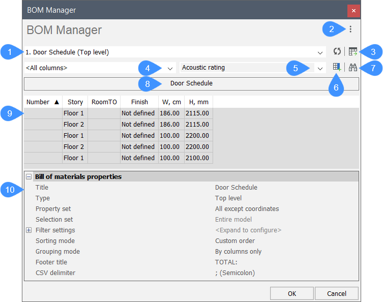 BricsCAD® BIM部品表マネージャーパネルでは、現在のBIMプロジェクトの部品表(BOM)の表示と編集が行えます。