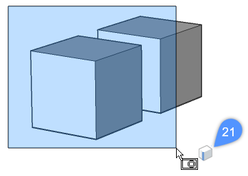 - 3Dソリッドやサーフェスのエッジを選択するには、ウィンドウ選択中にCtrlを2回押します。カーソルの横にエッジアイコン(21)が表示されます。選択モードがエッジに設定されている場合は、ウィンドウ内に完全に入っているエッジが選択されます。