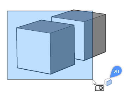- 3Dソリッドやサーフェスの面を選択するには、ウィンドウ選択中にCtrlを1回押します。カーソルの横にあるアイコン(20)が選択モードを示します。選択モードが面に設定されている場合は、ウィンドウ内に完全に入っている面が選択されます。