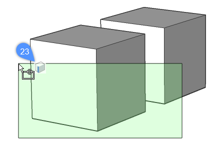 - 緑色の選択ウィンドウを使用して3Dソリッドとサーフェスのエッジを選択するには、ウィンドウ選択中にCtrlを2回押します。カーソルの横に面アイコンが表示されます(23)。完全にまたは部分的に交差ウィンドウの内側にあるエッジが選択されます。