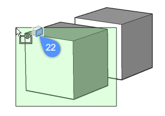 - 緑色の選択ウィンドウを使用して3Dソリッドおよびサーフェスの面を選択するには、ウィンドウ選択中にCtrlを1回押します。カーソルの横に面アイコンが表示されます(22)。完全にまたは部分的に交差ウィンドウの内側にある面が選択されます。