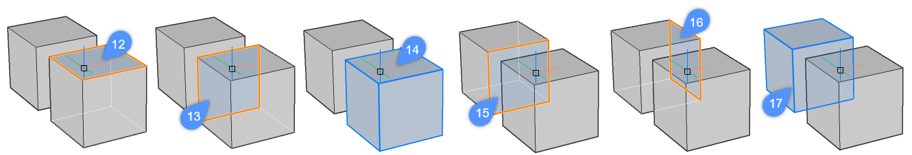 - カーソルを同じ位置に置いたままTabを繰り返し押すことで、前方のソリッド全体(14)、後方のソリッドの正面(15)、右の面(16)と順番にハイライト表示されます。最後に、背面のソリッド全体(17)がハイライトされます。