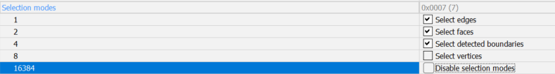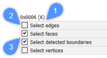 - リボンの設定パネルのボタンをクリックし、選択モードを選択します。 下図は、チェックボックスを1回クリックした後、エッジを選択と頂点を選択のオプションを無効にした場合(2)と、面を選択と検出された境界を選択を有効にした場合(3)のSELECTIONMODESシステム変数の値の合計(1)を示しています。