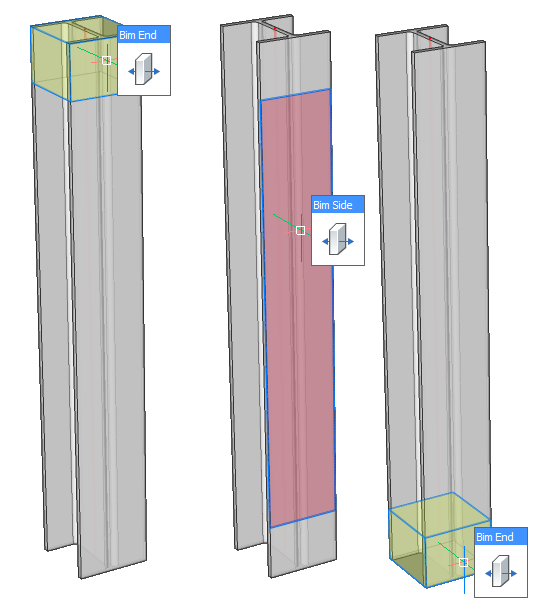 - モデル空間の線形ソリッドの上面または下面にカーソルがあるときに、線形ソリッドにカーソルを合わせます。Bim End面は黄色で表示され、線形ソリッドのBim Side面は赤で表示されます。