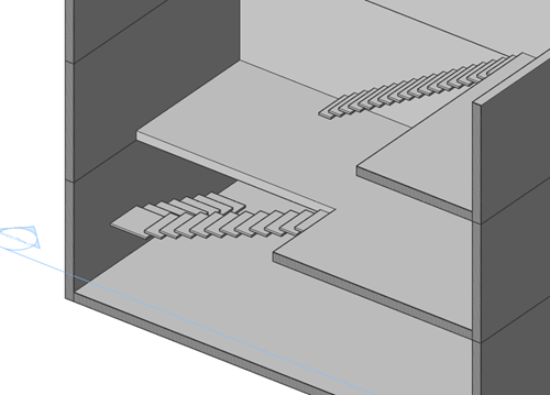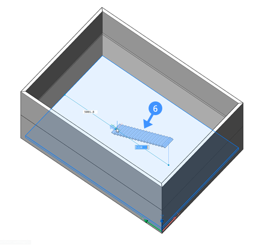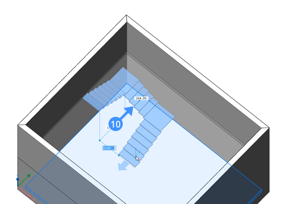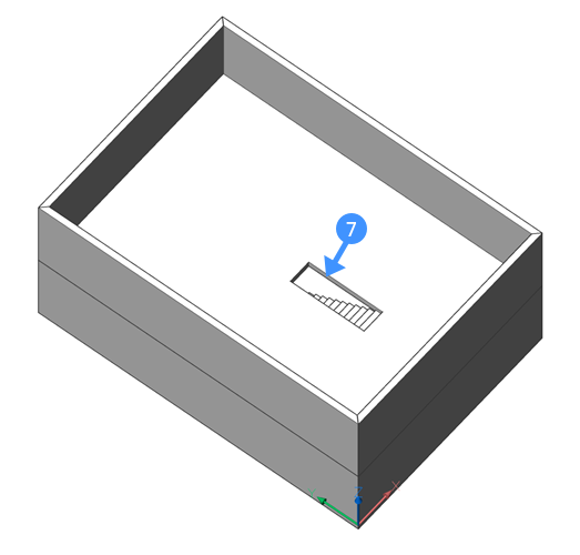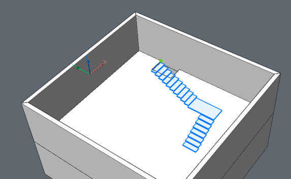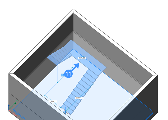 - カーソルが正しい位置に来たら、左クリックします。階段が作成されます。上部スラブには、ヘッドルーム設定(7)に対応した穴が自動的に生成されます。