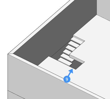 注: 作成される階段のライブプレビュー(青)が、マウスにダイナミックに追従します。(8)階段ツールは、階段ダイアログで指定された寸法に対応する階段の最適な構成を自動的に検出しようとします。最適な構成にスナップすると、このプレビューは少し暗い色で表示されます。 - プレビューが確認できたら、左クリックします。階段が作られ、穴(9)が自動的に生成されます。今回は、上段の長さや、ヘッドルーム階段の設定に応じて、穴をL字型にすることもできます。ヘッドルームが大きく、最上段の階段だけではカバーしきれない場合は、2段目の階段の一部にもかかるため、L字型になります。
