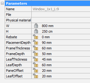 - (オプション)窓を作成した後で窓の寸法を調整するには、プロパティパネルに移動します。パラメータセクションまでスクロールダウンして、必要に応じてパラメータを変更します。コンポーネントライブラリのすべての窓とドアはパラメトリックです。注: 窓などでは、減算部分を含むソリッドをコピーや移動など操作している間、赤いプレビューで表示されるので、影響するソリッドを確認しながら配置できます。