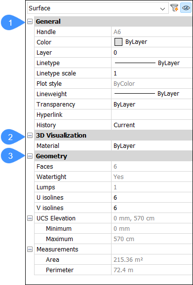 - 選択した図形の形状特性について説明します。サーフェスの場合、いくつかのオプションを使用できます。