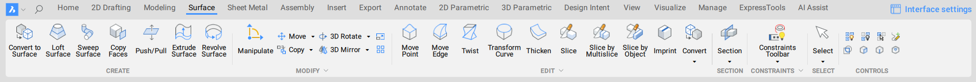 サーフェスモデリングツールは、メカニカルワークスペースリボンのサーフェスタブで使用できます。
