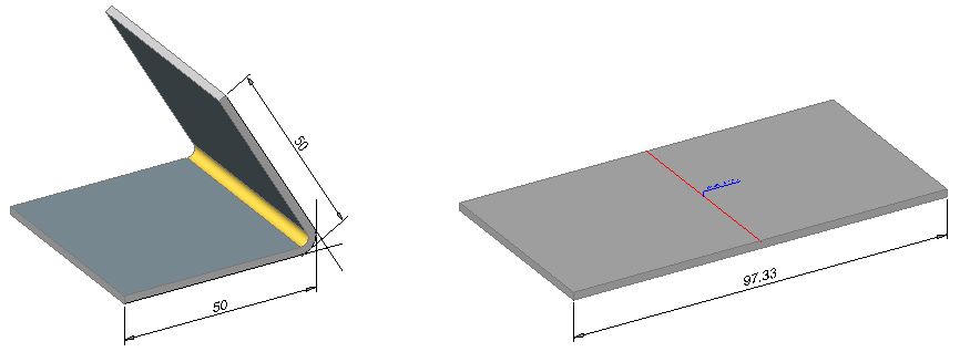 - 特定の選択では、ベンド_1を展開すると、ベンドテーブルから3番目のサブテーブルがベンド展開長補正に使用され、値1.8が用いられます。残りのベンドについては、DieWidthが設定されている場合を除き、デフォルトのダイ幅なしの値が適用され、1番目のベンドテーブルが適用されてベンド半径が1、90度の場合に値2.1が用いられます。Note: ベンドにDieWidthを割り当ててドキュメントを保存すると、値がベンドに保存されます。ただし、次に図面を開いたときに、 DieWidth値を別のベンドに割り当てるには、ファイルをリロードボタン(