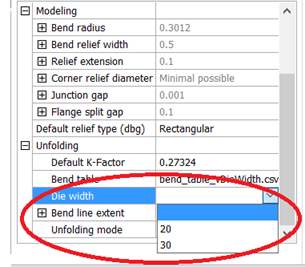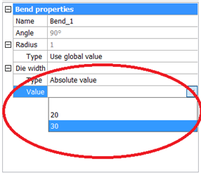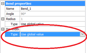 このグローバル設定では、パーツの厚さに適したデフォルトのダイ幅値を選択できます。この値はデフォルトで部品内のベンドに割り当てられます。メカニカルブラウザでベンドを選択し、ベンドのプロパティを確認します。