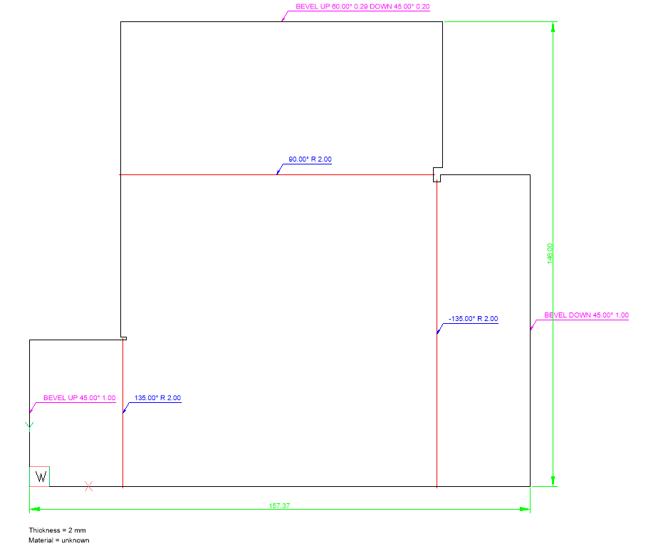 ベベルフィーチャーは、板金部品に対して行われる面取り加工を表します。BricsCAD V21のレベルでは、各ベベルは正確に単一のフランジ上にある必要があります。ベベルを作成する特別な操作はないため、DMCHAMFERコマンドをフランジのエッジで使用し、DMROTATEを使用してベベル角度を調整する必要があります。SMCONVERTコマンドはベベルを認識し、SMUNFOLDによって処理されます。ベベルフィーチャーはSMDELETEとSMREPAIRコマンドでもサポートされています。
