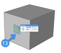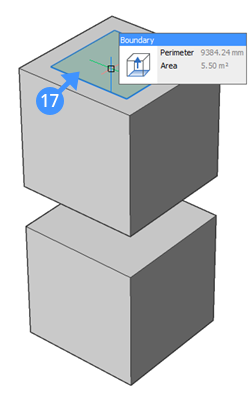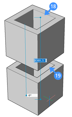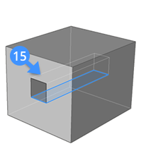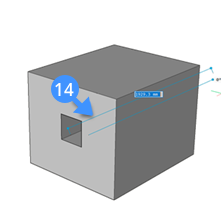 • 下の図は、メカニカルおよびBIMワークスペースのメインソリッドから減算された図形を示します。(4つの押し出しモードシステム変数すべてのデフォルト値 = 1)図形をハイライト表示して(13)内側に押し出すと(14)、メインソリッドからボリュームが減算されます。(15)